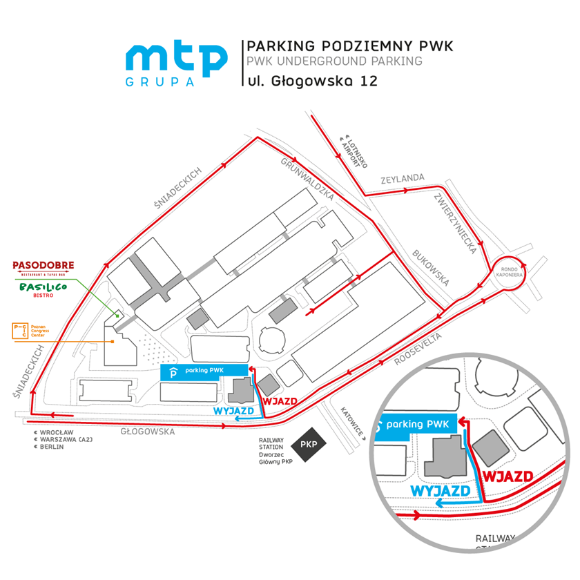 Zwiedzających zapraszamy na parking podziemny - Parking PWK. 3-poziomowy parking podziemny posiada 650 miejsc parkingowych i zlokalizowany jest przy ulicy Głogowskiej 12. Wjazd na parking znajduje się tuż za budynkiem Centrum Targowego, na wysokości dworca PKP, w miejscu po byłej restauracji Adria. Na terenie parkingu znajdują się specjalne przestrzenie dla osób z niepełnosprawnościami. |