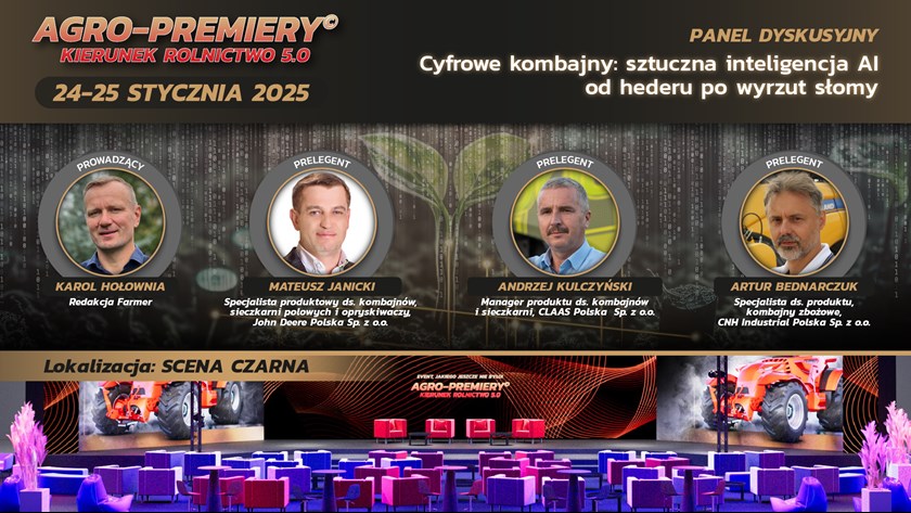 Już w sobotę, 25 stycznia, o godzinie 11:00 na Scenie Czarnej podczas wydarzenia AGRO-PREMIERY odbędzie się jeden z najbardziej oczekiwanych paneli dyskusyjnych tegorocznej edycji. Pod hasłem „Cyfrowe kombajny: sztuczna inteligencja od hederu po wyrzut słomy” eksperci z wiodących firm w branży rolniczej podzielą się swoją wiedzą i doświadczeniem.